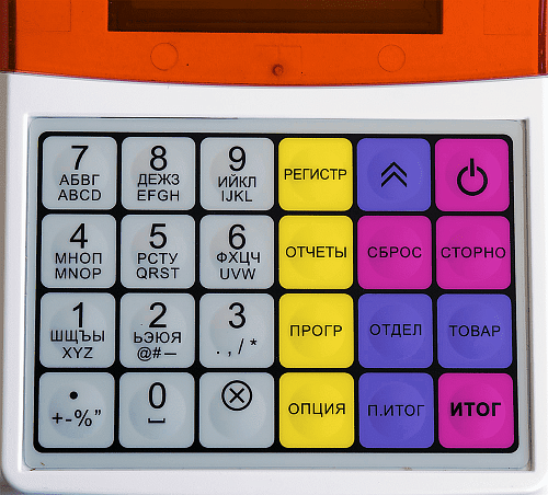 На всех клавишах нанесены надписи, это удобно при работе кассира.