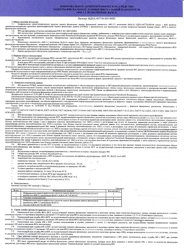 • шифровальное (криптографическое) средство защиты фискальных данных фискальный накопитель "ФН-1.2 исполнение Эв36-3".
