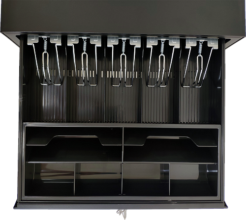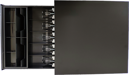 Денежный ящик с автоматическим замком для подключения к POS-системам и кассовым аппаратам. Имеет 7 секций под банкноты 4 под монеты. на передней панели расположены 2 секретные прорези для купюр большим номиналом.